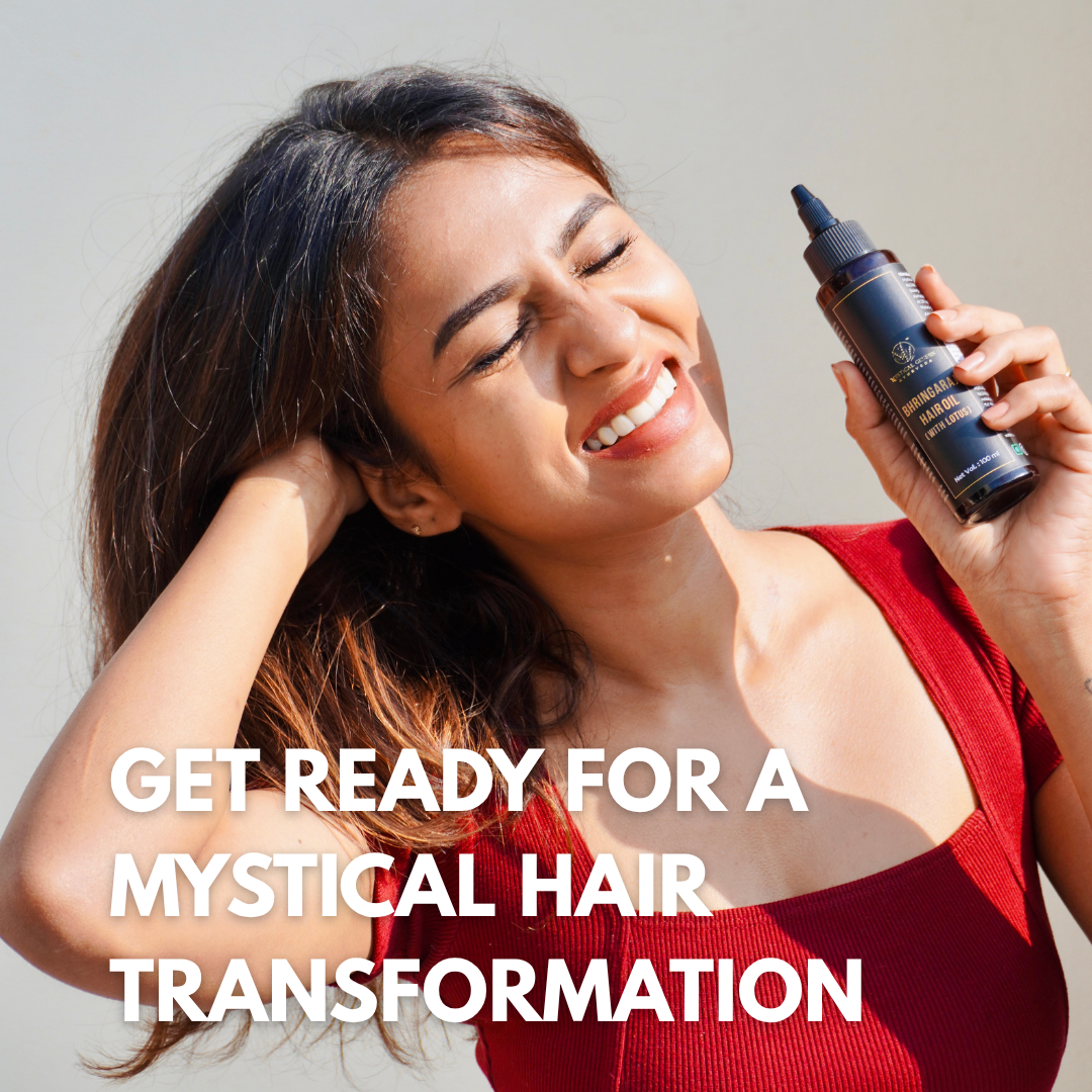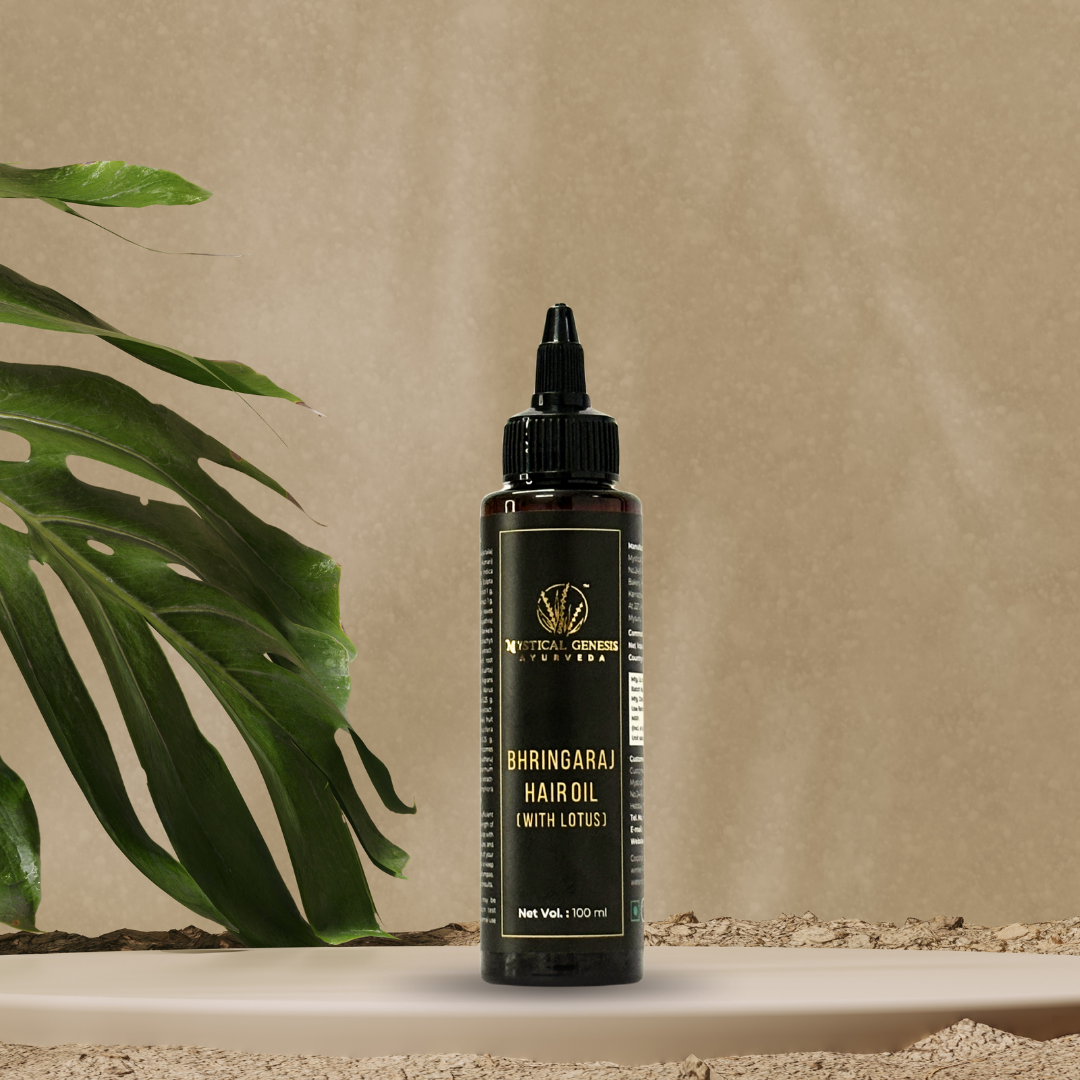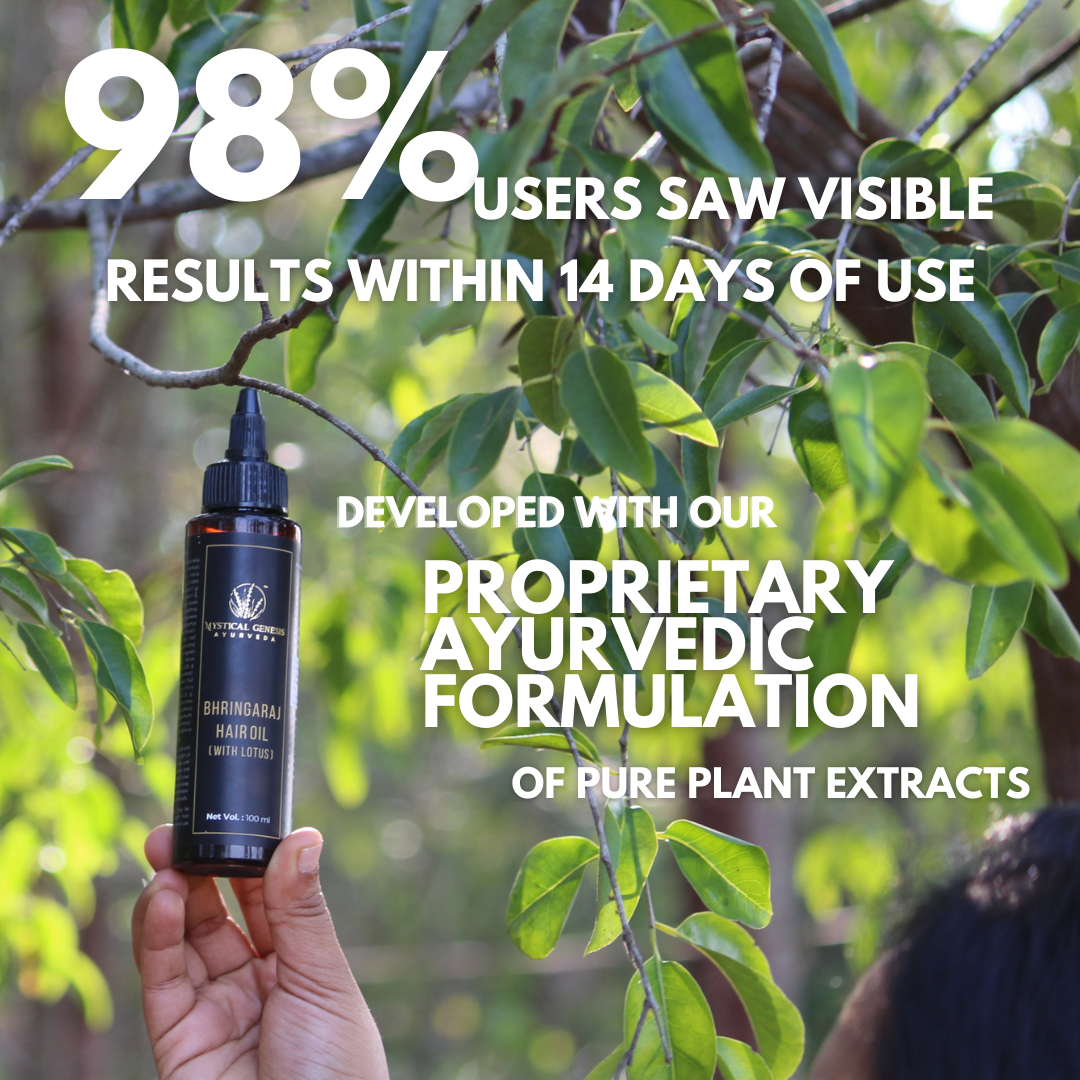 Regularly massaging your scalp with Mystical Genesis Ayurveda’s Bhringaraj Hair Oil works like a natural Ayurvedic treatment for hair fall.