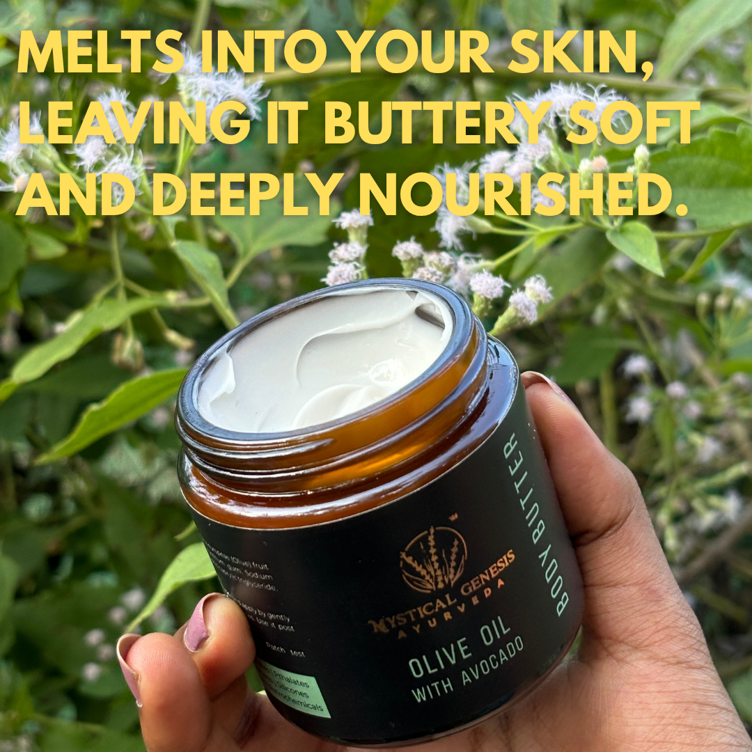 This ayurvedic body butter with olive oil is a perfect treat for your skin. It provides superior, long-lasting hydration to leave the skin feeling soft, smooth, and glowing. This luxurious, daily hydrator infused with shea butter, mango butter, avocado butter, argan oil, jojoba oil and much more, absorbs quickly into the skin and helps to revive the skin cells, moisturizes, deep nourishes and brightens the skin making it satin smooth.